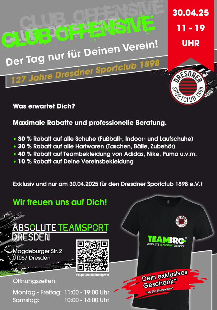 Flyer Sonderaktion im Absolute Teamsport Dresden am 30. April 2025 (Grafik: Geschäftsstelle)