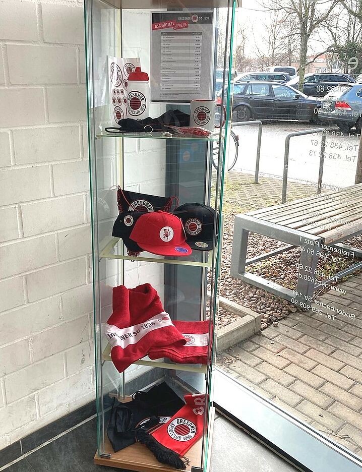 Fanartikel-Vitrine in der DSC-Trainingshalle im Januar 2022 (Foto: Geschäftsstelle)