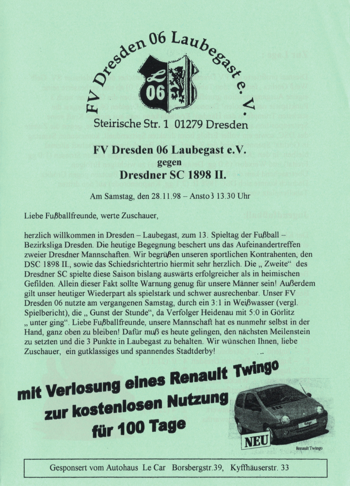 Titelblatt des Auswärts-Programms der 2. Mannschaft vom 28. November 1998 (Quelle: Reproduktion aus Originalvorlage)