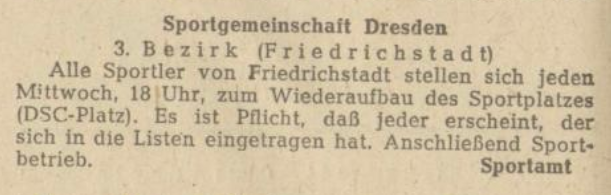 Aufruf der SG Friedrichstadt zur Mithilfe an der Schadensbeseitigung im Sportpark Ostragehege auf der Seite 4 der Ausgabe 56 vom 25. Juli 1945 der "Tageszeitung für die deutsche Bevölkerung" (Quelle: Reproduktion aus historischer Originalvorlage)