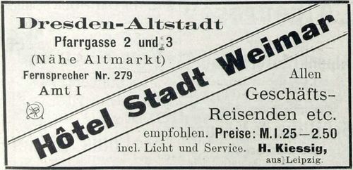 In der Pfarrgasse 2 und 3 empfing bis 1896 das Hotel Stadt Weimar seine Gäste. Inhaber war Josef Georg Rosenberger, der mit seinem Hotel 1896 in die Waisenhausstraße 2 umzog, wo es bis 1945 geöffnet hatte.