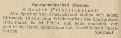 In der Ausgabe 30 vom 24. Juni 1945 der Tageszeitung für die deutsche Bevölkerung wurde auf Seite 6 der Gründungsaufruf der SG Friedrichstadt veröffentlicht. Er richtete sich an die Mitglieder der verbotenen Friedrichstädter Sportvereine Dresdner SC, ATV Dresden und Post-SG Dresden sowie an die Friedrichstädter Arbeitersportler bis 1933, die hauptsächlich dem ASV Dresden-Friedrichstadt und der SpVgg 02 Dresden-Friedrichstadt angehörten.